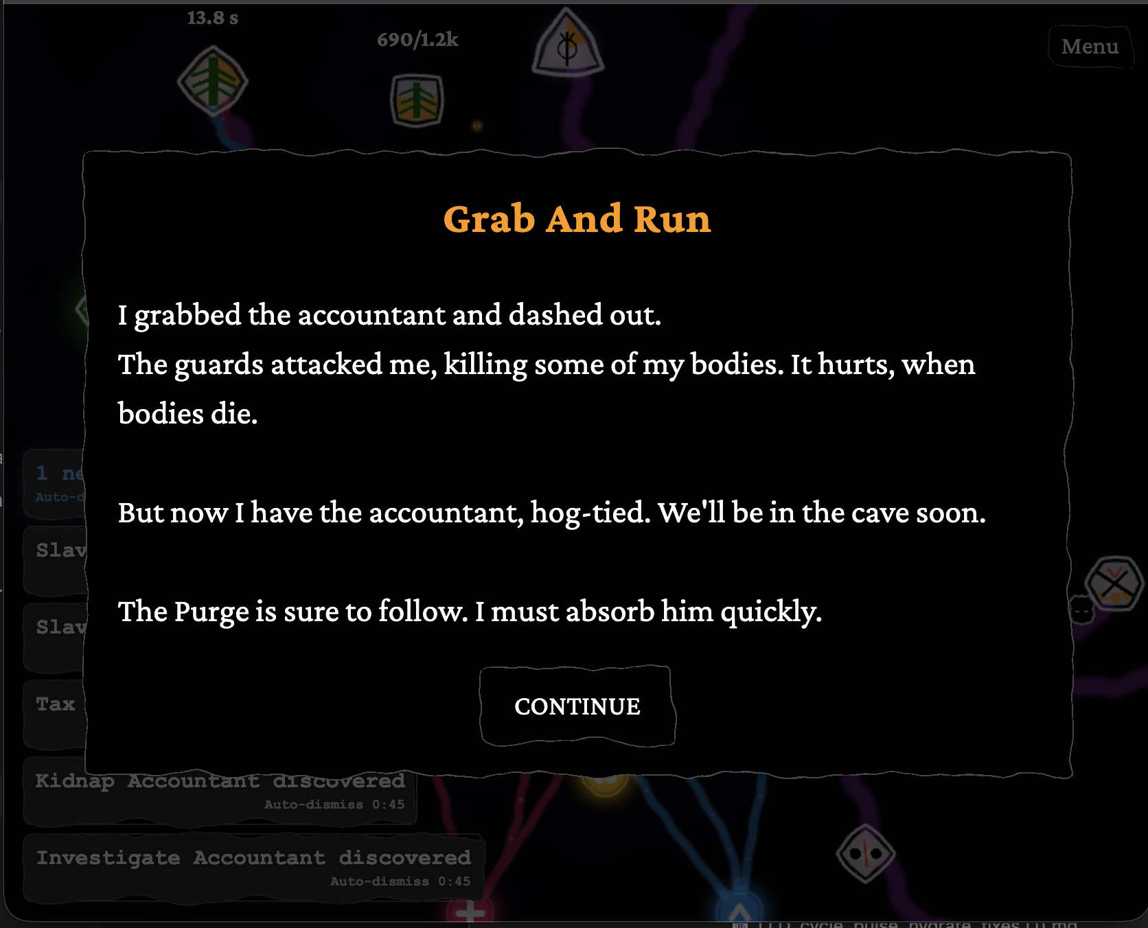 the objective was clear: survive by using bodies to do my bidding. it could be a little clearer how to manage properly- I can't seem to balance enough to collect more than three-4 hosts at a time.
